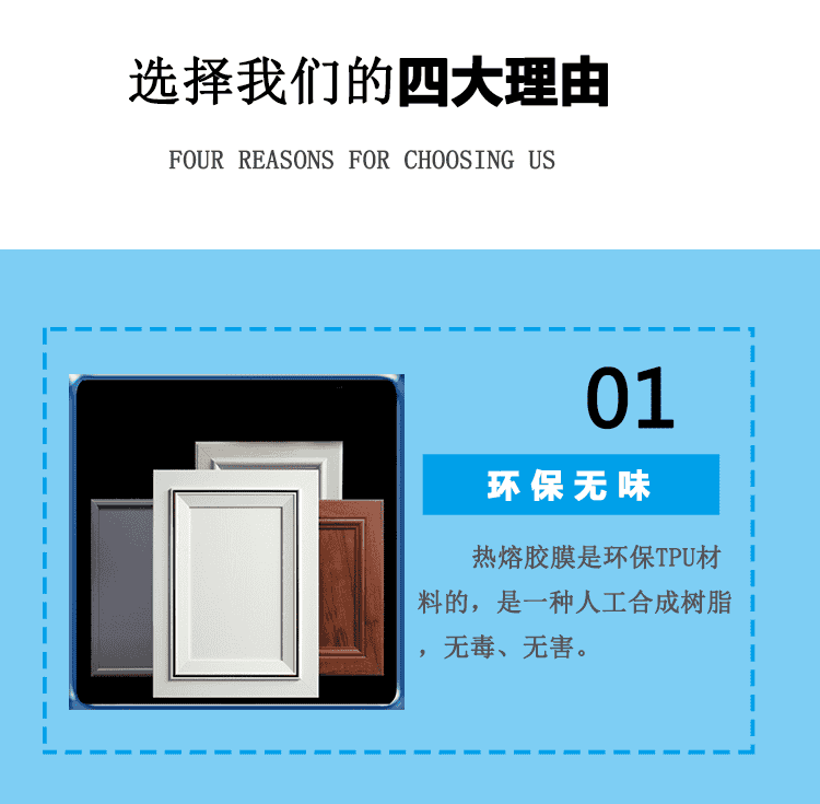 | 功能 | 主要用于吸塑门、模压门替代喷胶工艺,直接将胶膜贴合在PVC装饰膜的背面,节省人工、提高质量的同时又能降低成本. |