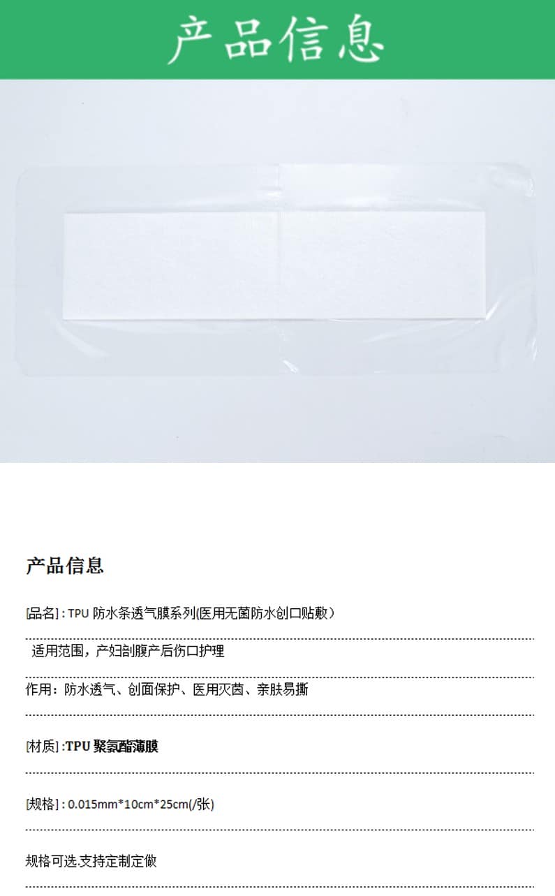 赞晨新材料,医用防水透气膜的作用具有防水透气功能,在军事、医用、防户外运动等领域中一直广受关注。就如这款无菌产后敷贴,剖腹产后贴,保护剖腹产创口术后也能洗个安心...